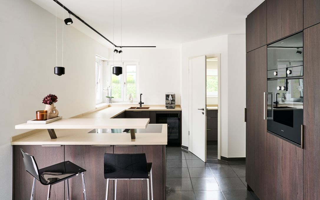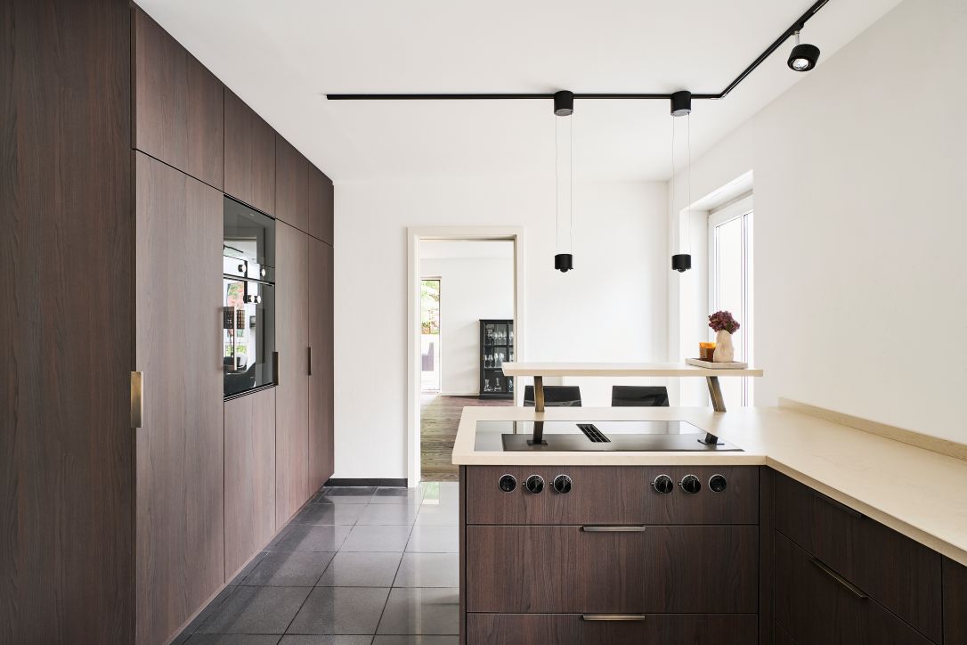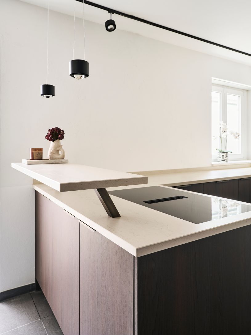 Die Arbeitsplatte aus Kunststein Dekton Danae ultramatt überzeugt durch ihre hohe Widerstandsfähigkeit gegenüber Kratzern, Flecken und Hitze und bietet auch eine angenehme Haptik und eine edle Optik, die perfekt zu den warmen Holzfronten der Küche passt.