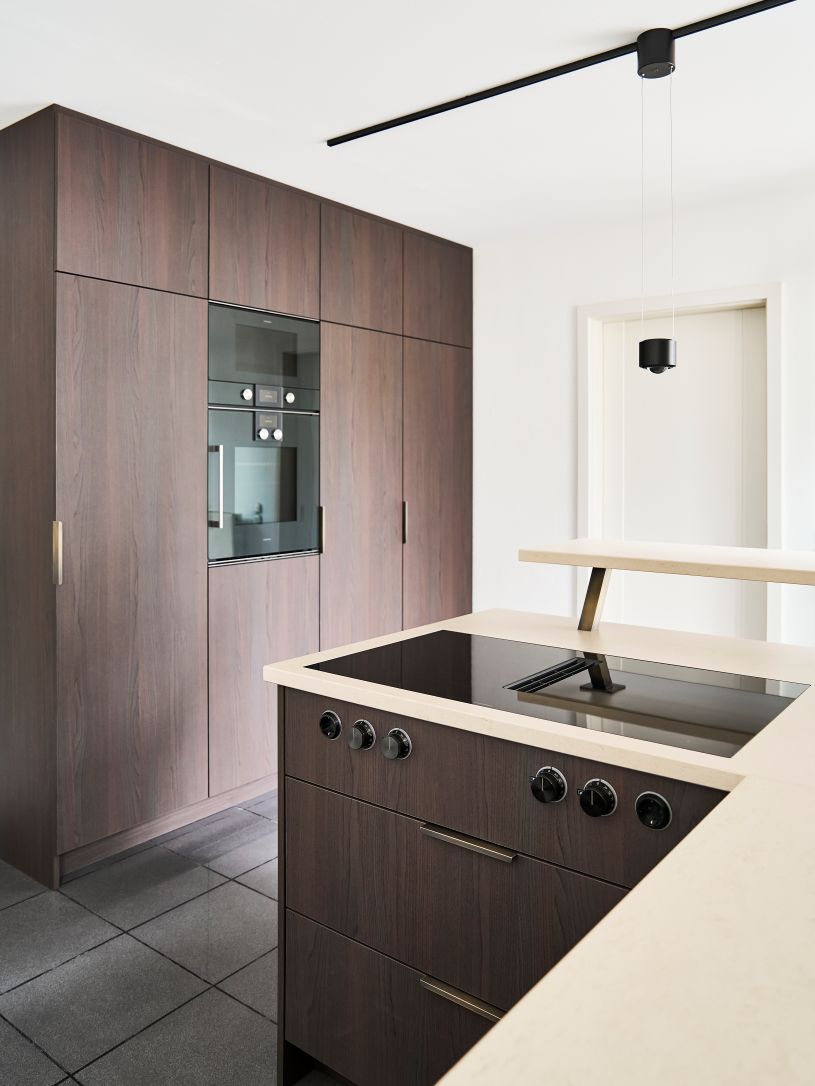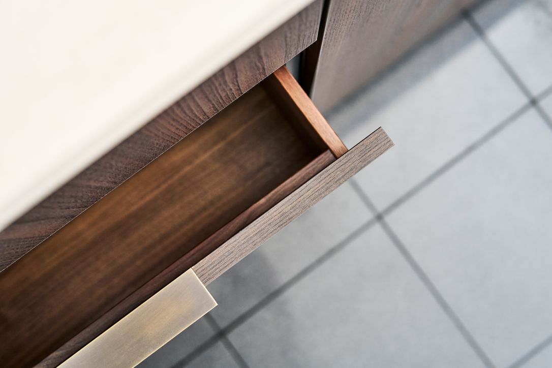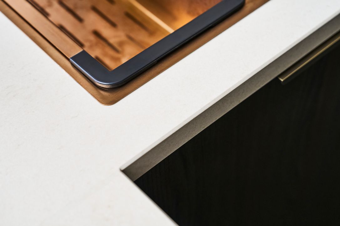 Besonders hervorzuheben sind die Bronze-Griffe, eine Sonderanfertigung vom Schlosser, die in die Kante der Möbel eingelassen sind. Diese greifen das handwerkliche Design der Küche auf und setzen einen stilvollen Akzent.