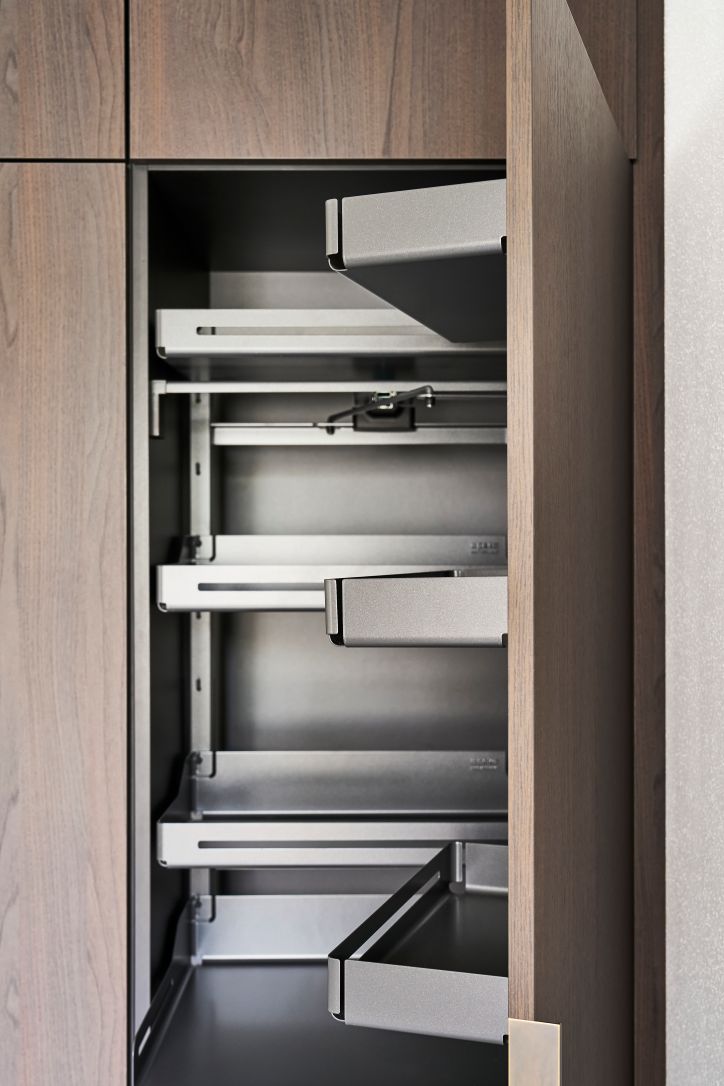 Für zusätzlichen Stauraum und Ordnung sorgen der Hochschrank-Innenauszug mit Türregal in anthrazit sowie der Eckschrank-Schwenkauszug „Le Mans Style“ von Kesseböhmer.