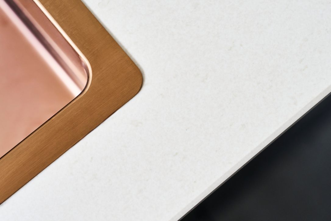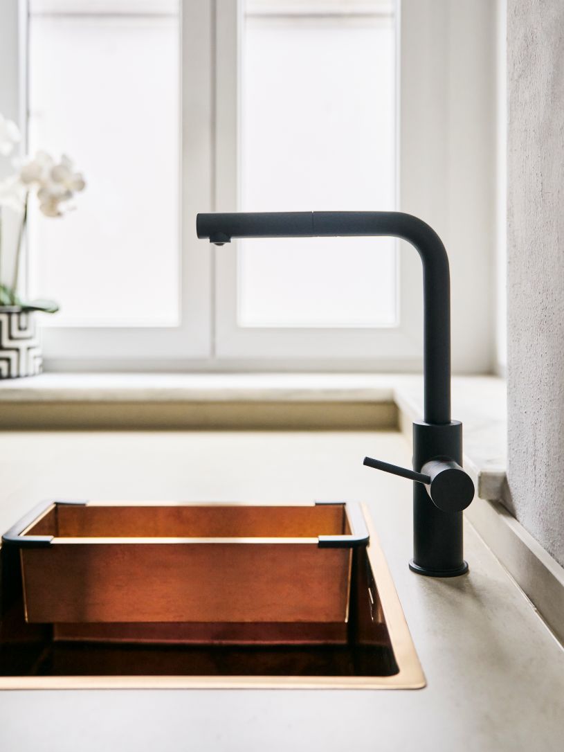 Die Reginox Kupfer-Spüle setzt einen warmen, edlen Akzent und ist nicht nur funktional, sondern auch ein echtes Designstück, das sich harmonisch in das Gesamtbild der Küche integriert.
