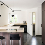 Schlichte Küchenzeile mit gegenüberliegendem Hochschrank für